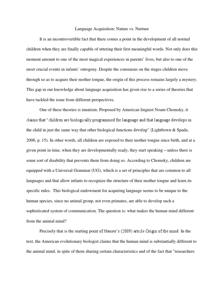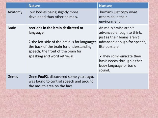 Nature Vs Nurture Language Acquisition. In our second video on language acquisition, we ask how children are able to acquire language as rapidly and systematically as they do. Nature refers to all of the genes and hereditary factors that influence who we Schoneberger T.