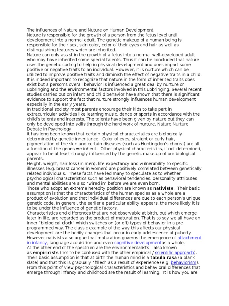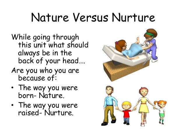 When scientists talk about nature vs. nurture, nature is limited to biological (and often just to genetic) factors, whereas nurture encompasses. Nature and nurture are two terms used in behavioural psychology. Firstly, in order to compresence the complexity of our debate, we have to take in mind the definition of nature and nurture.